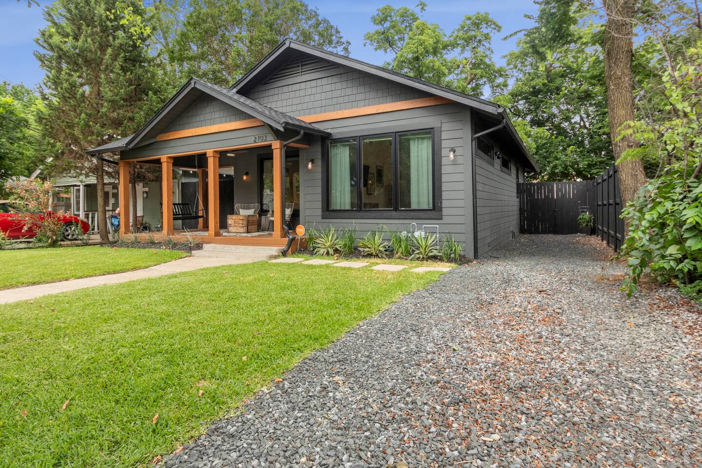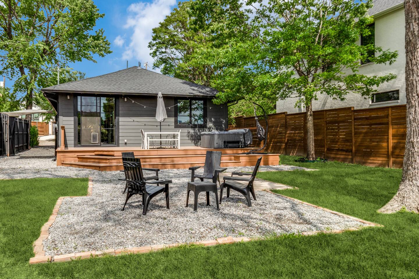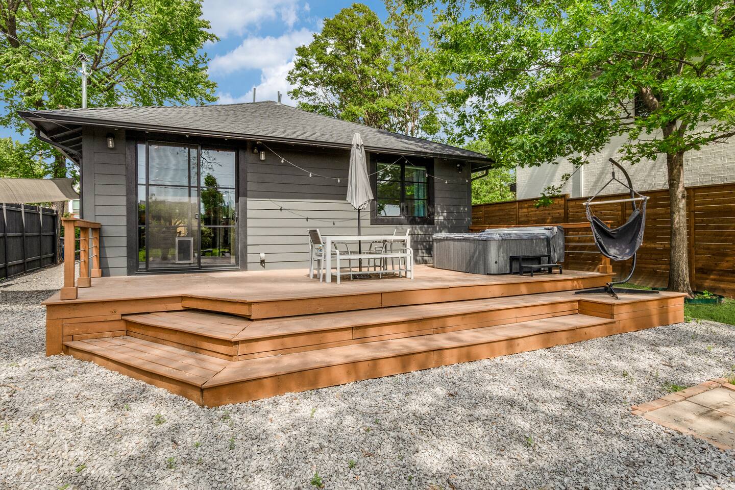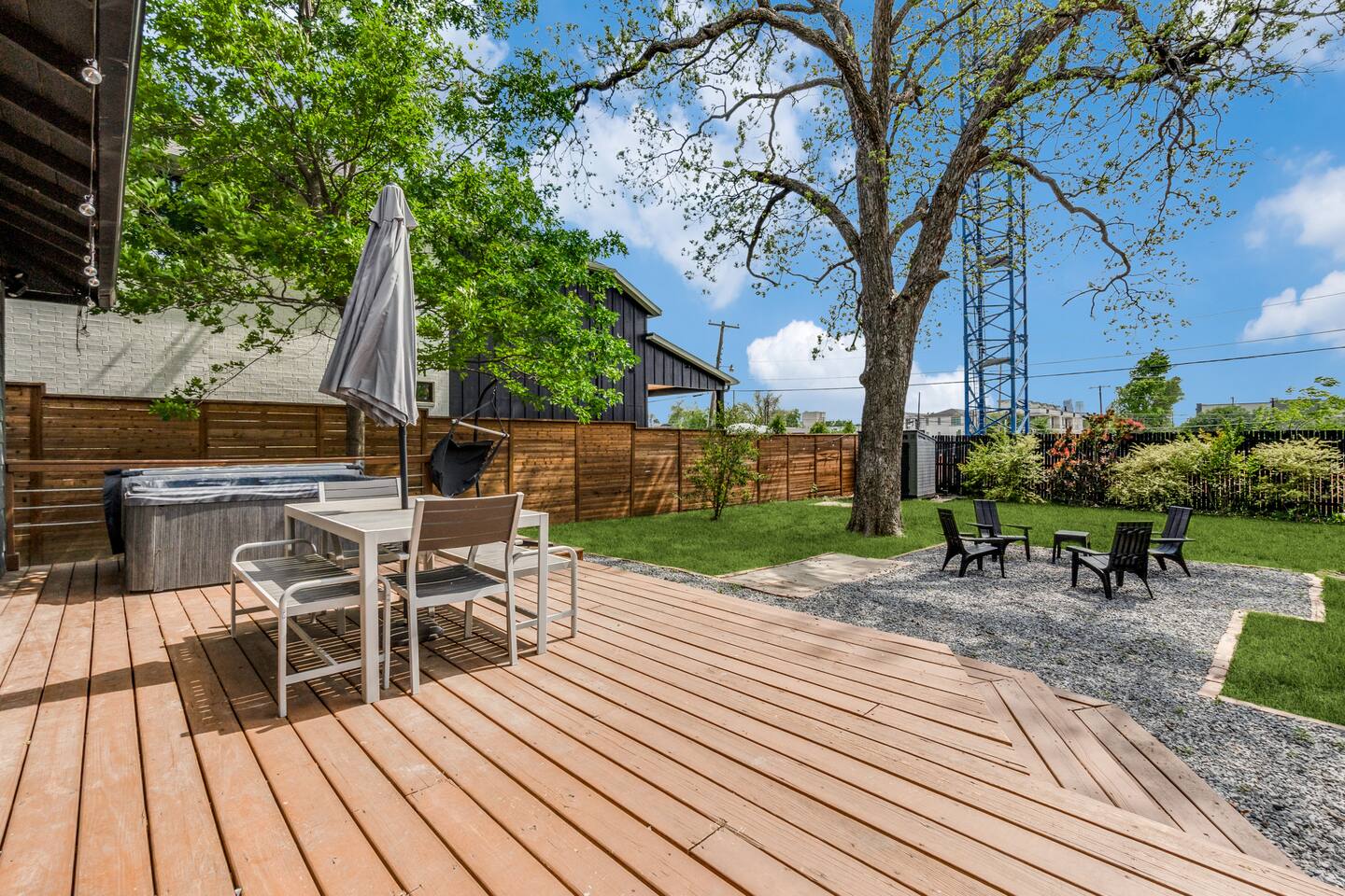 Soaring ceilings and designer finishes define this expertly renovated home in Dallas' most diverse, vibrant and walkable neighborhoods. Welcome to Lower Greenville! Custom cabinetry, plenty of prep surface, ample storage and gleaming Viking Appliances. This kitchen is as functional as it is beautiful. We have included all the normal housewares you might need to prepare and serve a meal. The modern and spacious primary bath includes dual custom-built vanities, full glass shower and soaking tub. The guest room is outfitted as a double twin or king based on your preference. A large backyard, perfect for pets, is partially sharded by an 80+ year old Pecan. Soak up the sun on the expansive back deck, dine al fresco (with seating for 6) or relax in the sparkling hot tub. Crushed bluestone drive accommodates three vehicles off street - This home does not include a garage.